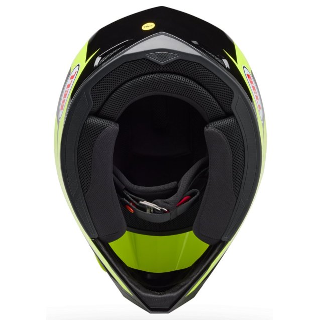 Шолом Bell MX-10 MIPS — легкий мотокросовий шолом початкового рівня з полікарбонатним корпусом вагою 1300 г, захистом MIPS, козирком Flying Bridge та знімним мундштуком для вікенд-райдерів, початківців та любителів їзди по бездоріжжю. Наступник моделі MX-9 MIPS із оновленим стилем та розширеним діапазоном розмірів від XS до XXL. Легкий полікарбонатний корпус вагою лише 1300 г забезпечує комфорт протягом усього дня їзди. Захист MIPS знижує ротаційні навантаження при ударах. Бамперна система NMR із м'якого матеріалу EPP з обох боків шолома стискається при навантаженні та повертається до початкової форми, знижуючи ризик вторинних травм. Козирок Flying Bridge без центральної стійки підвищує гнучкість, покращує аеродинаміку та вивільняє місце для додаткового захисного матеріалу у зоні удару. Знімний мундштук забезпечує додатковий комфорт та захист. Антимікробна підкладка зберігає свіжість після кожного заїзду. Шолом готовий до встановлення Bluetooth-систем зв'язку — передбачені кишені для динаміків. Подвійна сертифікація DOT та ECE 22.06.